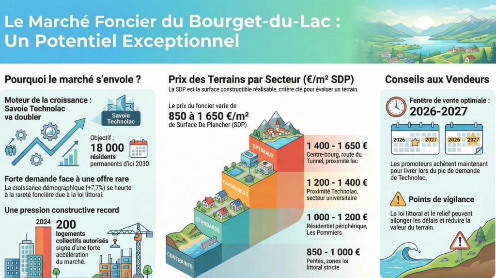🎯 Positionnement vendeur : Marché vendeur affirmé porté par la convergence entre la rareté foncière induite par la loi littoral et l’explosion démographique programmée de Technolac. Les propriétaires de terrains constructibles bénéficient d’un rapport de force favorable avec des délais de vente raccourcis et une concurrence active entre opérateurs pour sécuriser le foncier rare. Les valorisations 2026-2027 intègreront mécaniquement l’anticipation du doublement du technopôle.